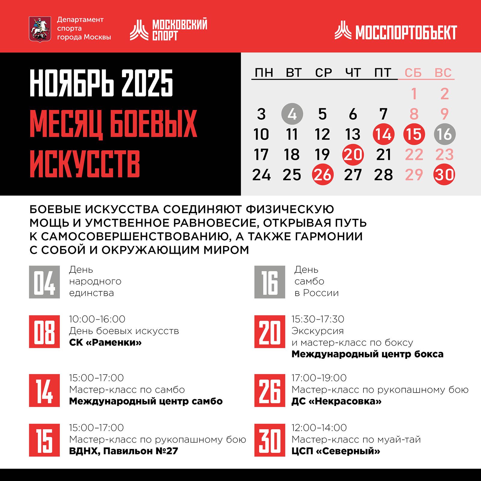 Тематический месяц стартует 8 ноября с Дня боевых искусств в спортивном комплексе «Раменки». 14 ноября детей в возрасте от 12 до 16 лет приглашают на мастер-класс по самбо в Международный центр самбо, а 15 ноября все желающие в возрасте от 15 до 55 лет смогут попасть на мастер-класс по рукопашному бою, который пройдет с 15:00 до 17:00 в павильоне №27 на ВДНХ.