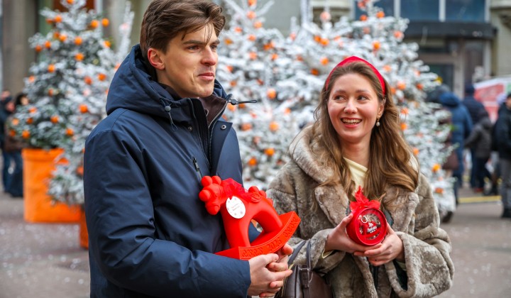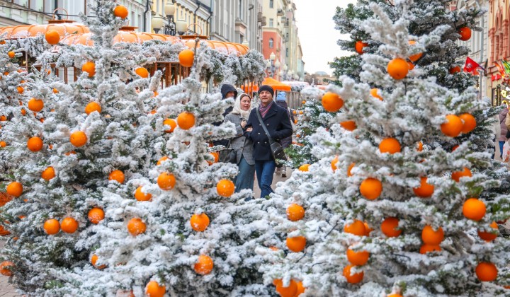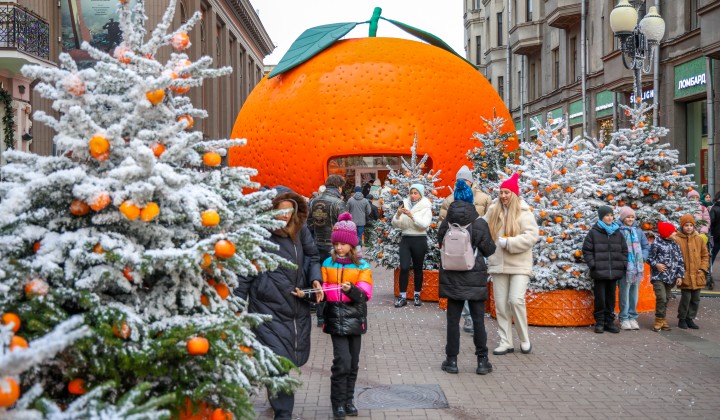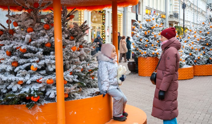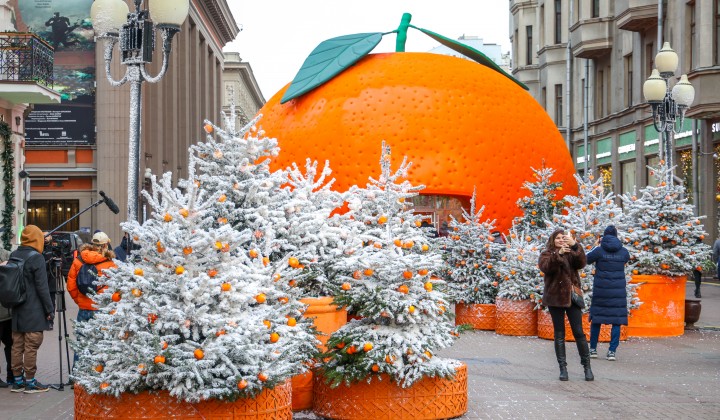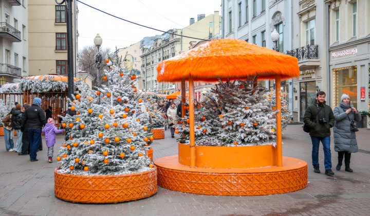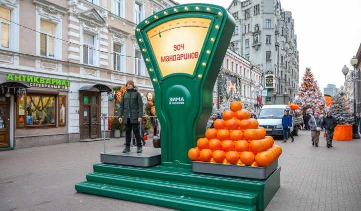 А старый Арбат оформили в мандариновой тематике. Помимо павильона-мандарина и «мандариновых» елок здесь установили советские торговые весы, где роль гирек выполняют мандарины.