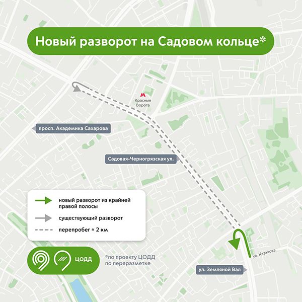 Благодаря таким проектам ЦОДД в этом году на Садовом кольце открыли пять новых разворотов: два — перед Дубининской и Татарской улицами, еще два — перед проспектом Академика Сахарова на внешнюю и внутреннюю сторону Садового кольца и один — перед зданием Международного информационного агентства «Россия сегодня». Эти изменения позволили сократить перепробег на нескольких участках кольца на один-два километра, а время в пути — до 10 минут.