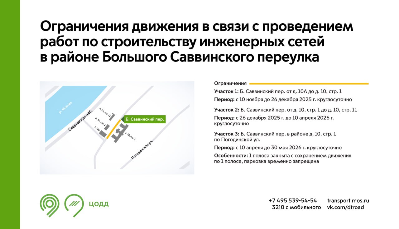 «С 10 ноября 2025 года до 30 мая 2026 года на участках Большого Саввинского переулка будет недоступна для движения одна полоса. Это связано с проведением работ по строительству инженерных сетей. Также на участках ограничения будет временно запрещена парковка», — говорится в материале.