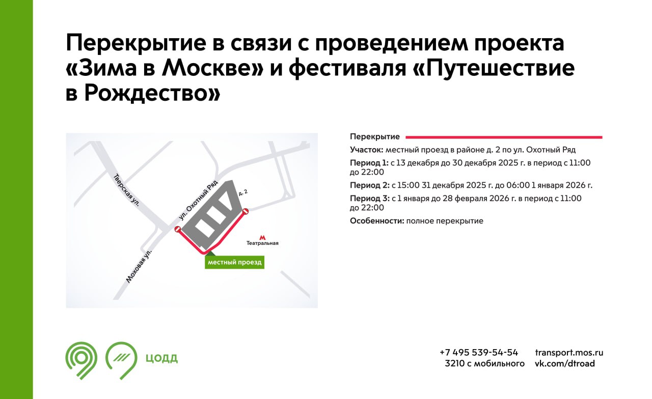 «До 28 февраля 2026 года в зависимости от времени участок местного проезда в районе дома 2 по улице Охотный Ряд закрыт для движения. Это связано с проведением проекта "Зима в Москве" и фестиваля "Путешествие в Рождество"», — говорится в материале.