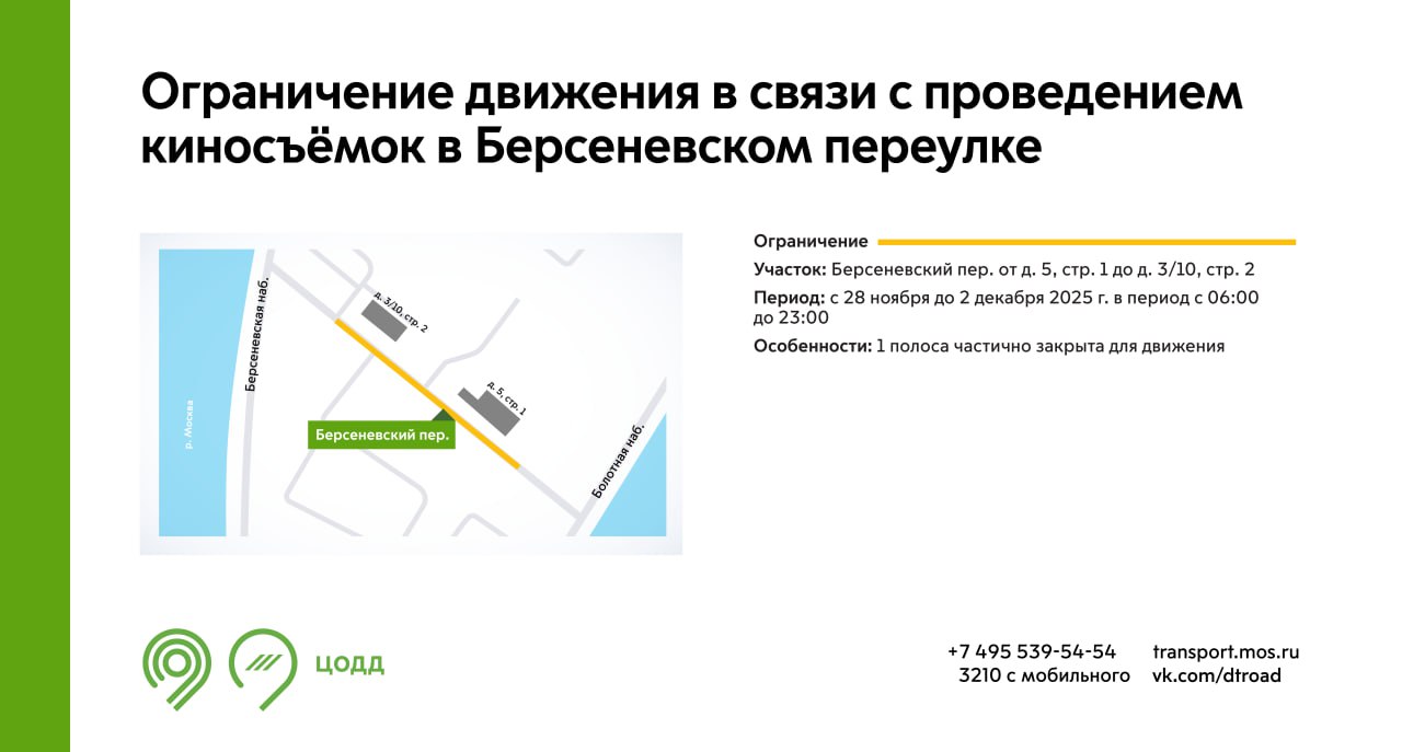 «С 28 ноября до 2 декабря в период с 6:00 до 23:00 на участке Берсеневского переулка от дома 5, строение 1 до дома 3/10, строение 2 будет недоступна для движения одна полоса», — говорится в сообщении.