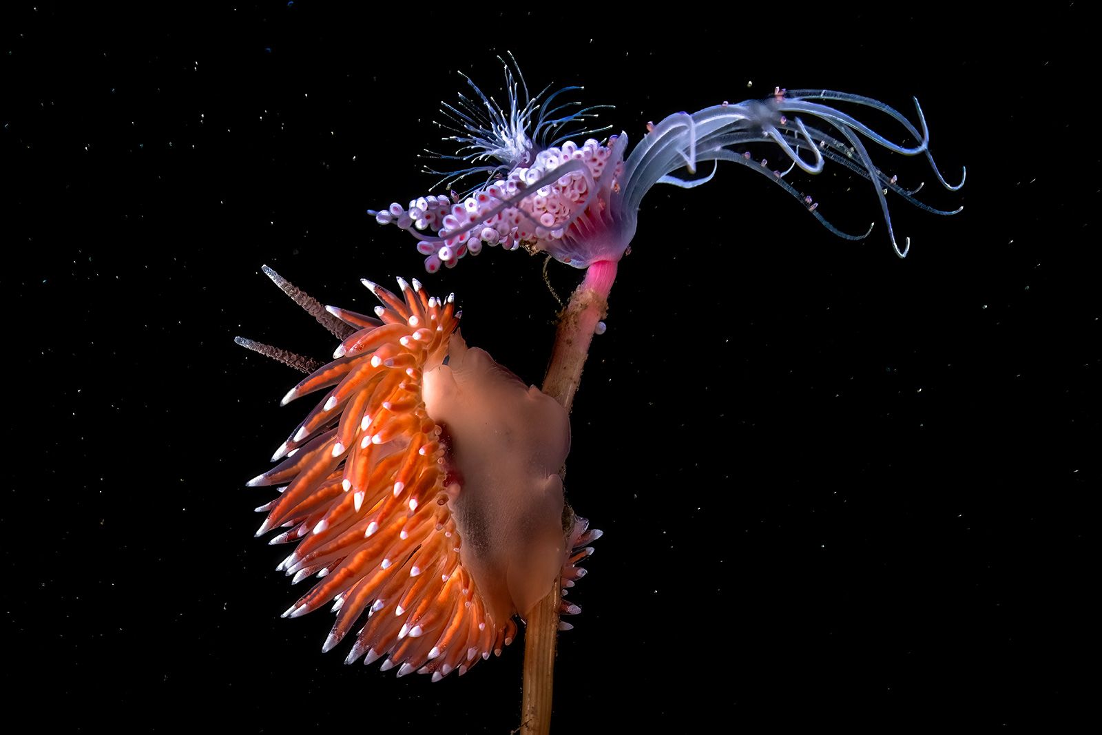 Андрей Носик показал, как выглядит морской макромир. Сюжет его снимка, правда, несколько печальный, но от этого не менее завораживающий: голожаберный моллюск корифелла, довольно распространенный в Белом море, подобрался вплотную к гидроидному полипу тубулярии, отдаленно напоминающему цветок с тонкими пушистыми наростами вместо лепестков. Совсем скоро полип станет ужином моллюска.