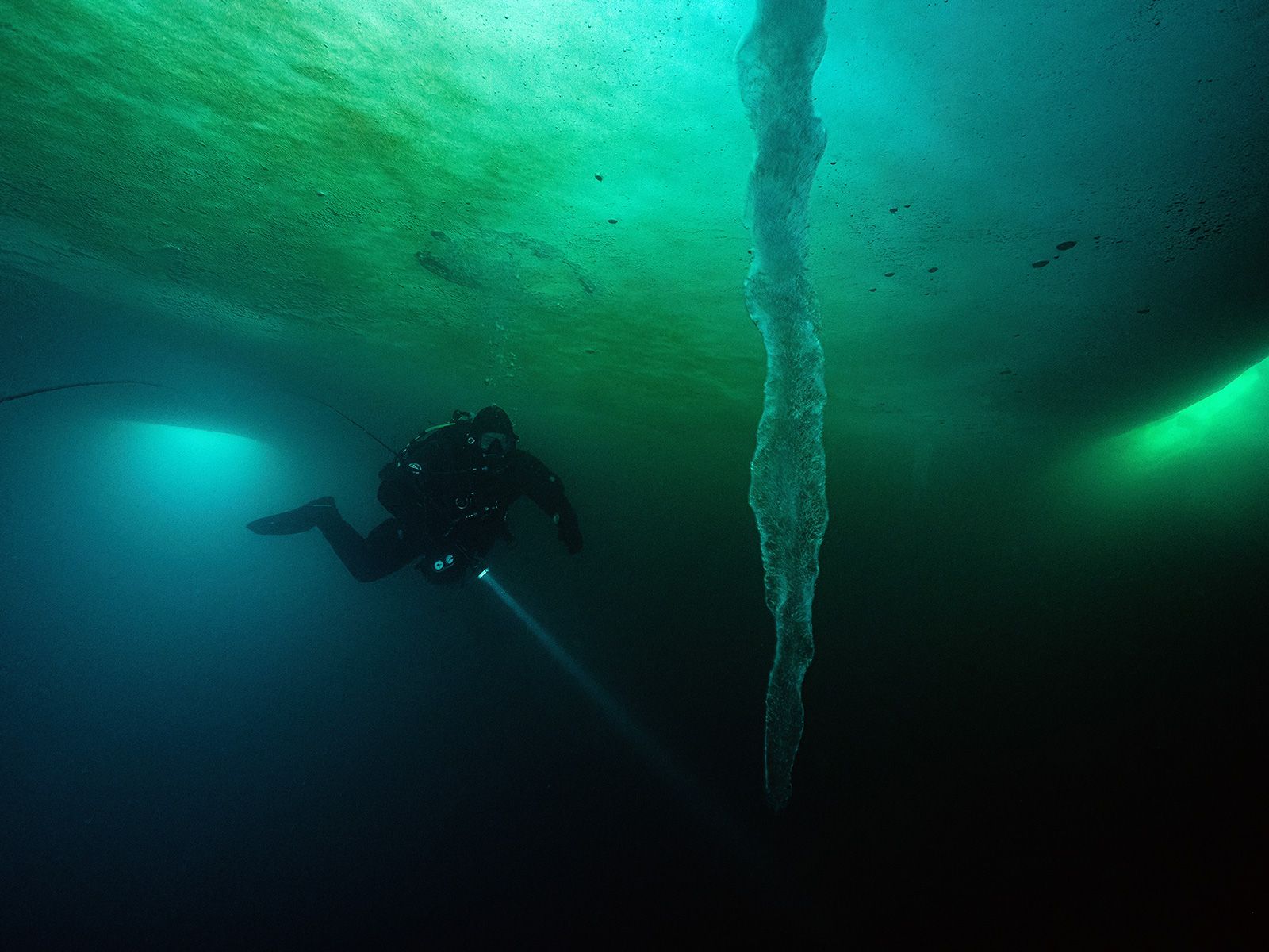 Сергей Шанин запечатлел так называемые ледяные пальцы смерти (брайниклы), похожие на подводные сталактиты. Они образовываются при столкновении потока ледяной воды с очень соленой.