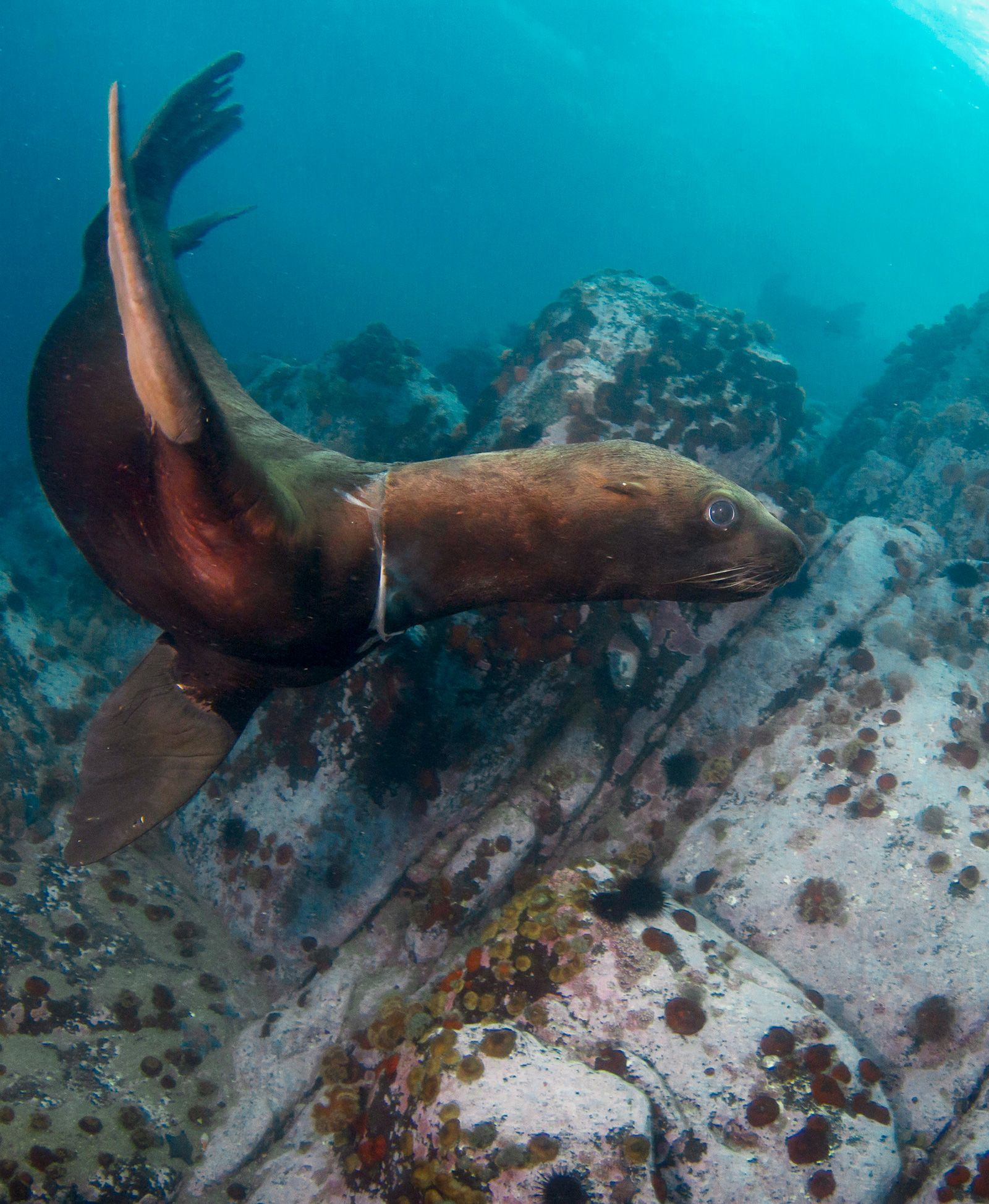 Автор снимка не столько любуется запечатленным на нем детенышем северного морского льва Стеллера (сивуча), сколько призывает задуматься об отношении к природе. Численность этих животных катастрофически сократилась за последние годы, их занесли в Красную книгу России. На популяцию напрямую влияет загрязнение океана: любопытные сивучи не прочь поиграть с проплывающими рядом покрышками, пластиком и многим другим, не зная, что все это может привести к печальным последствиям.