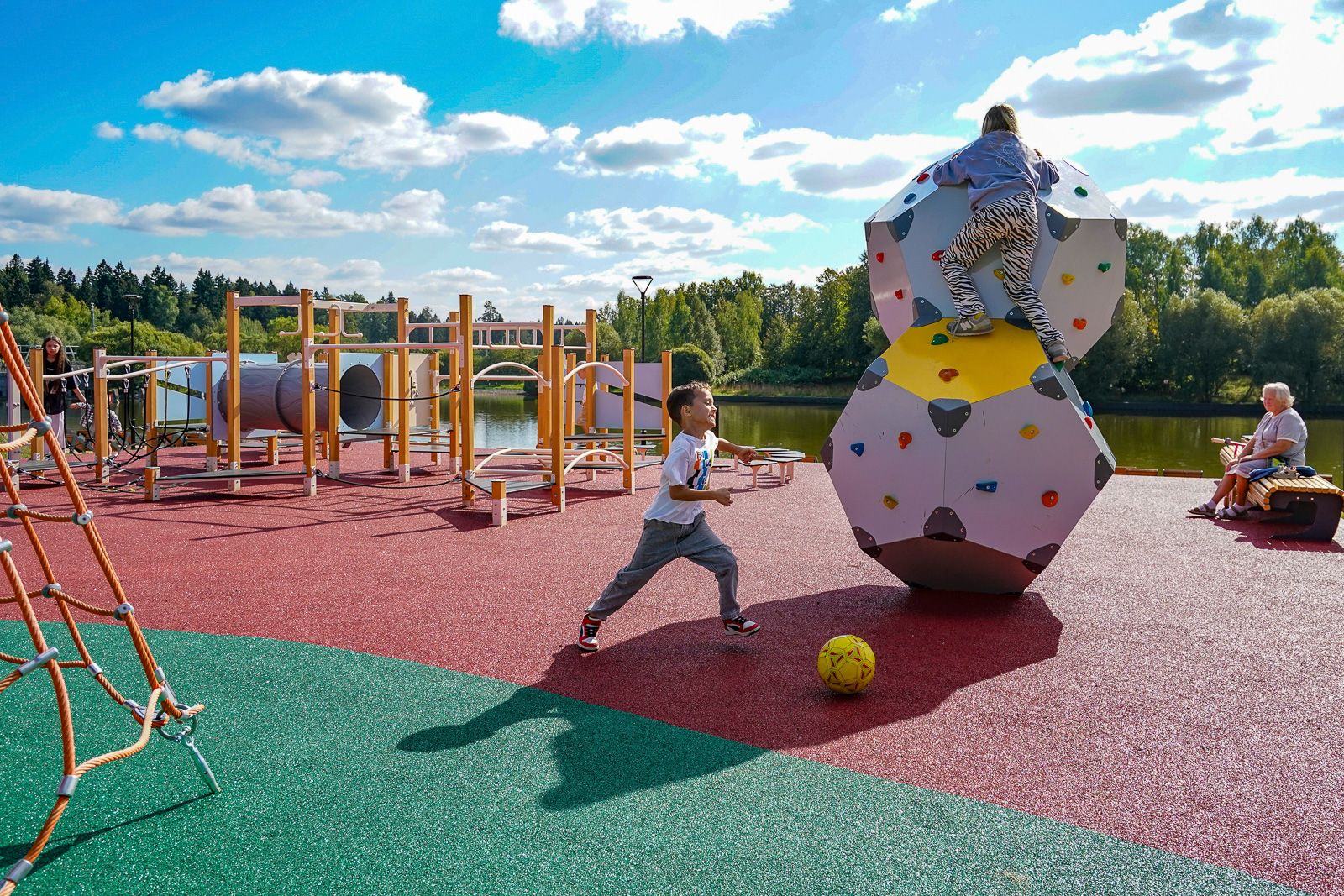 Вдоль берега пруда и прогулочных дорожек появились удобные парковые качели и скамейки для отдыха. Для детей обустроили большую игровую зону с мини-скалодромом, лестницами, разнообразными канатными элементами для лазанья, кольцами и горкой. Специалисты обновили покрытие пешеходных дорожек, поставили опоры освещения с энергоэффективными светильниками.